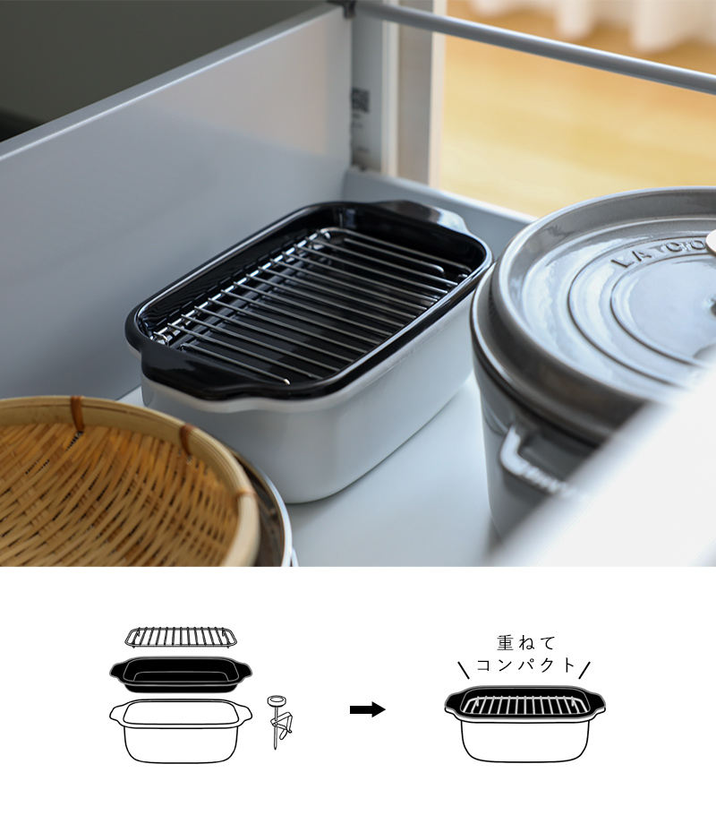 鍋、バット、スノコ網、温度計を重ねておけるのでかさばらず、キッチンの棚や引き出しにもすっきりと収納できます。
