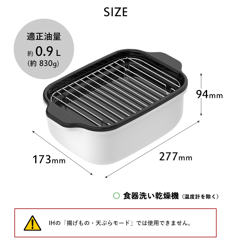 長さや大きさのある食材も揚げやすい長方形型はそのままに、本格使用もできるワイドサイズが登場しました。少量の油でもしっかりと食材が浸かり、揚げムラの無い美味しい揚げ物に仕上がる天ぷら鍋です。
