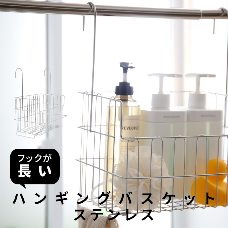 タオルバーを使って収納を増やせるのはいいけれど、ボディタオルはどうすればいいの?を解決した、前面にハンギングバーがついたデザインになっています。 ボディタオルはもちろん、お手持ちのフックを使えば洗顔ネットやボディブラシ等の小物をかけておくことが出来ます。サッと手にとれるので使い易さもアップします。 また浴室乾燥の物干し竿にバスケットを掛ける際には底面両サイドの脚部分を使って小物を掛けるとバスケットが安定してお使いいただけます。 |