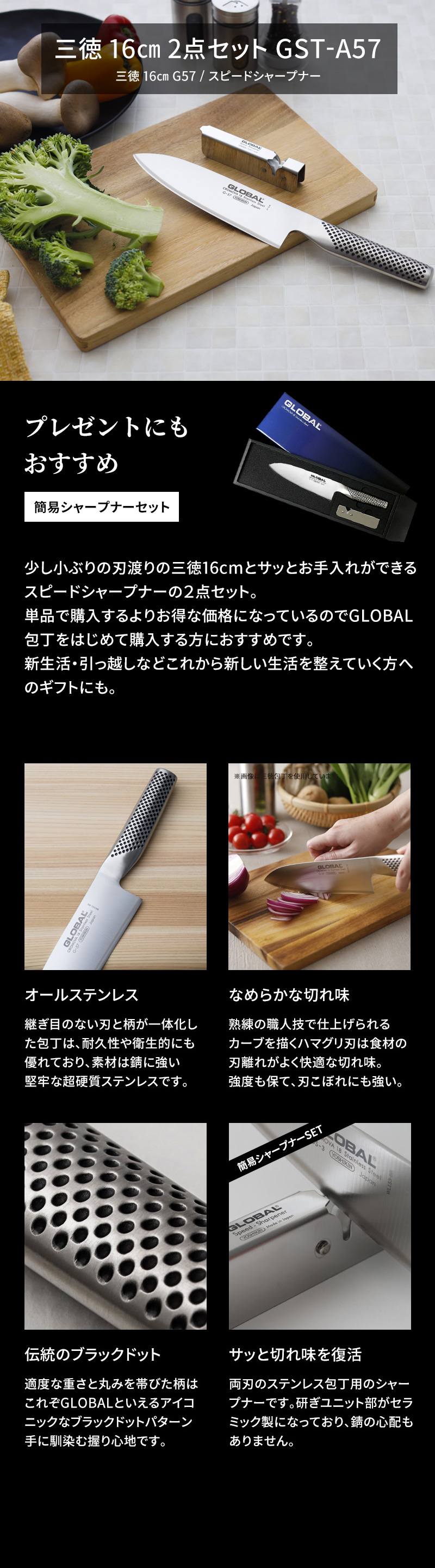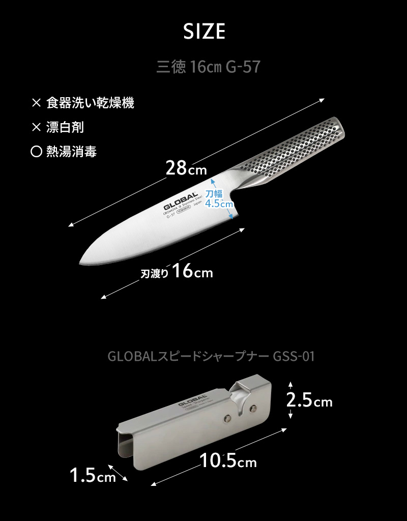 | 商品名 | GLOBAL グローバル 三徳(16cm)2点セット GST-A57 (三徳 16cm G-57/グローバルスピードシャープナー GSS-01) |