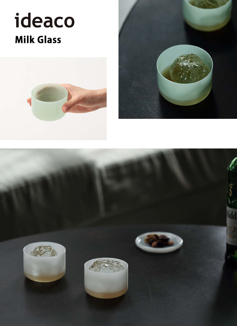 ガラスのような繊細さはなく陶磁器のような圧も感じない、独特な丸みのあるぽってりとしたフォルムが魅力のミルクガラス。飲み物・食べ物がふんわり透けて見えるユニークな見た目は食卓を明るく彩ってくれます。