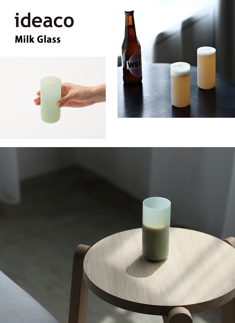 ガラスにミルクを溶かしたような乳白色の色合いが特徴で、飲み物を注いだ時や光が当たった時のミルクガラス独特の優しい透け感がとても美しいガラスです。