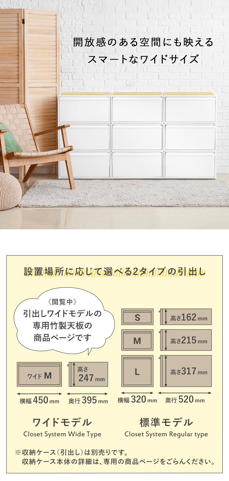 標準モデルより幅広デザインのクローゼットシステム ワイド専用の竹製天板。