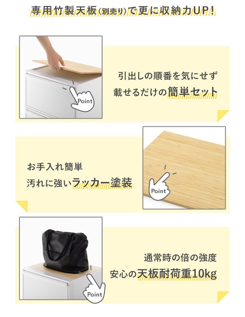 載せるだけで簡単に設置でき、手軽に無機質な衣装ケースに自然な風合いと高級感をプラスします。ラッカー塗装が施されているので、汚れや水分に強くキッチンや洗面所などの水回りで使用することも可能です。さらに、天板を置くことで耐荷重は通常の倍に!重いバッグの一時置きやディスプレイとしても活躍するデザイン性と機能性を兼ね備えたアイテムです。