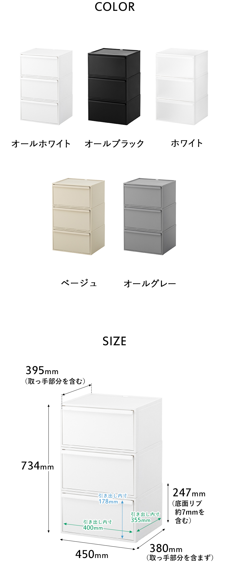 | サイズ | 外寸:約 幅450 × 奥行き395 × 高さ247mm(1個あたり) 奥行き詳細:約 395mm(取っ手部を含む)/約 380mm(取っ手部を含まず) 高さ詳細:約 734mm(3段) 引出し内寸:約 幅400 × 奥行き355 × 高さ178mm |