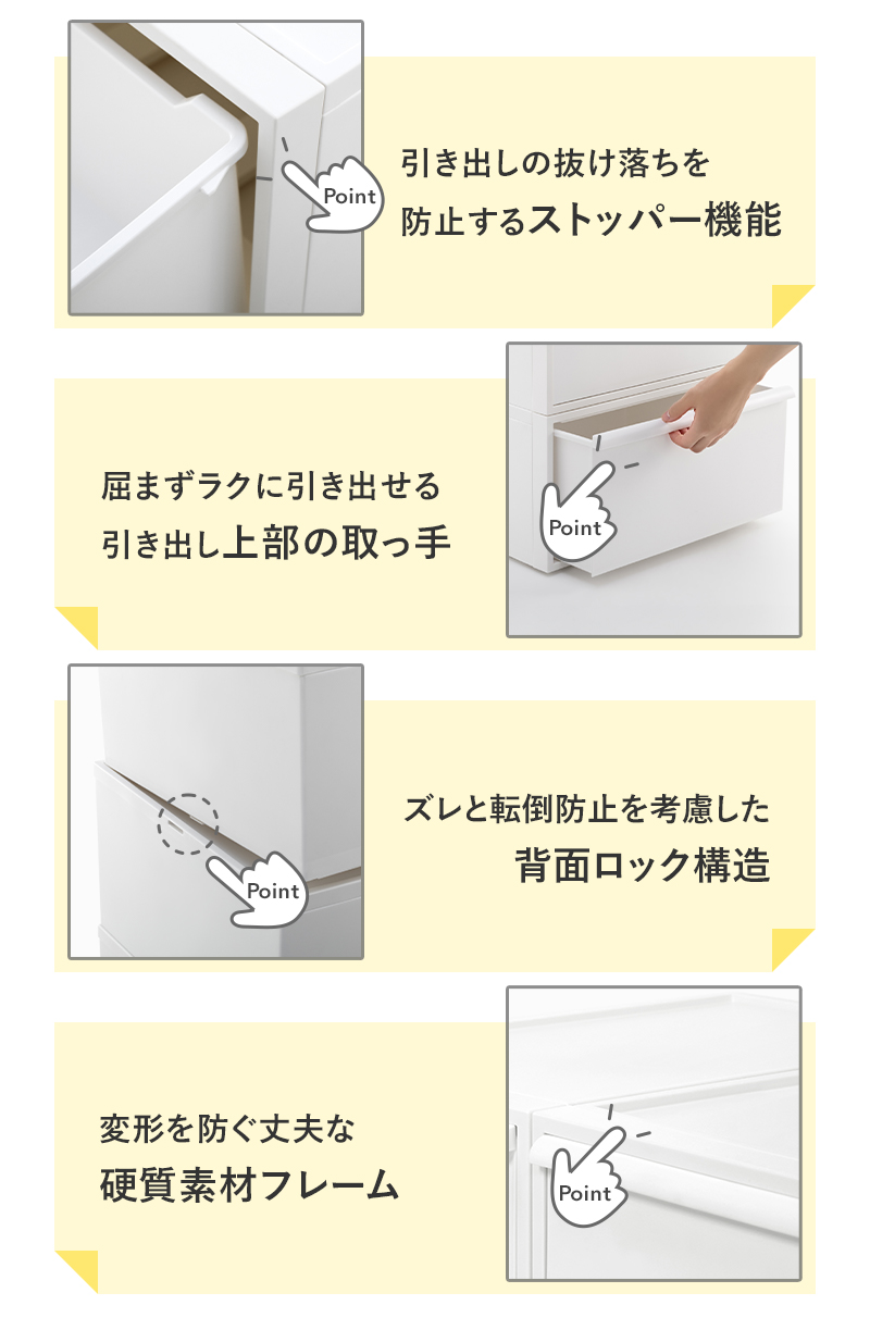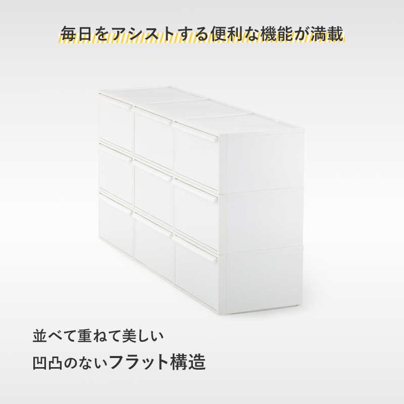 ほこりが溜まりにくいフラット構造と、直線的で美しいフォルムが魅力の引出しケース。背面ロックでしっかり安定し、抜け落ち防止ストッパーや、かがまず使える上部取手など、細部まで使いやすさにこだわった安心設計です。