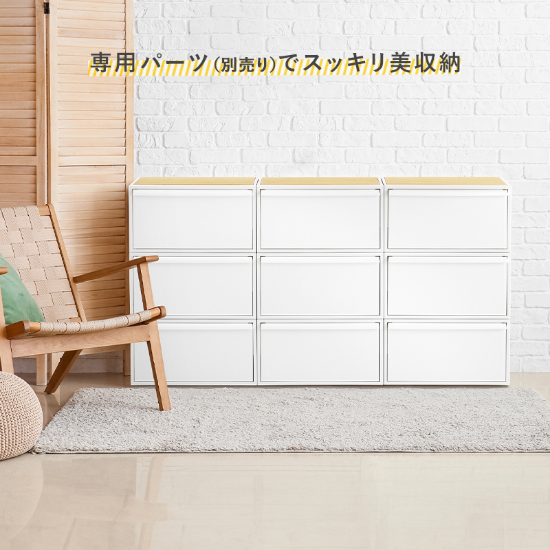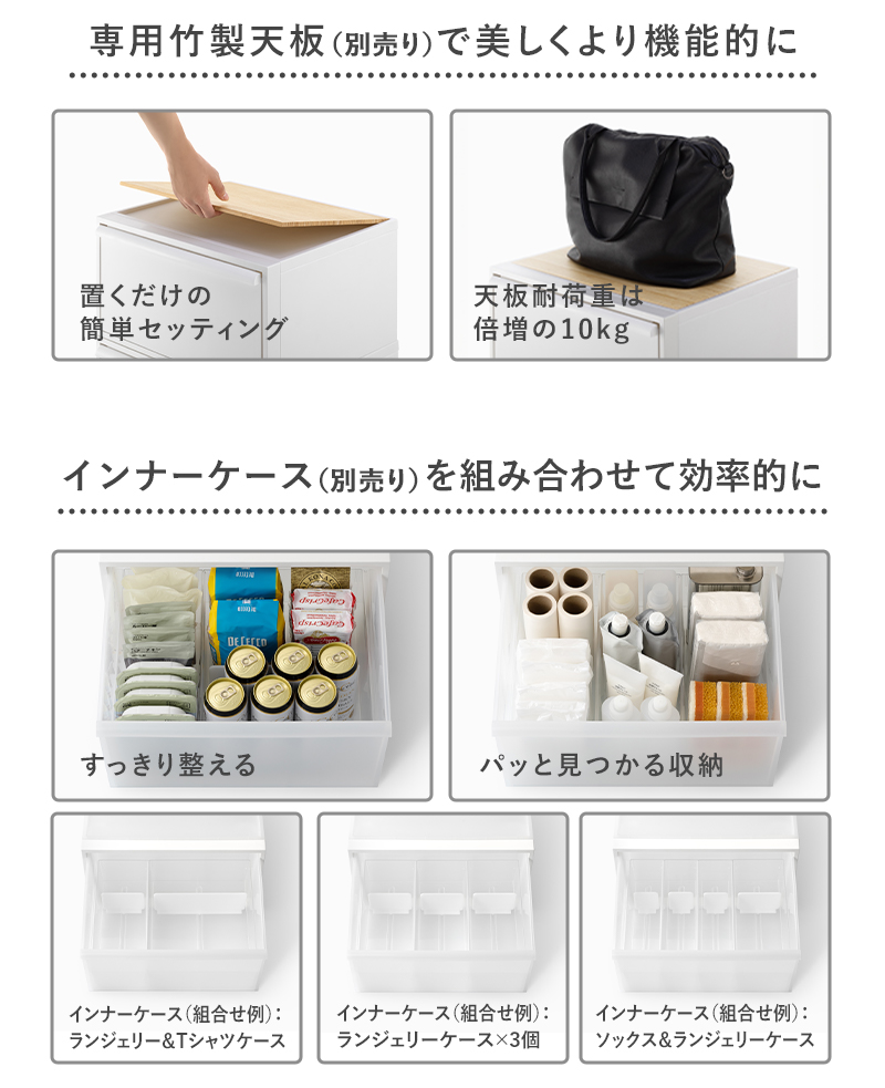 専用の天板(別売り)やインナーケース(別売り)を組み合わせれば、収納力がさらにアップ。見た目もすっきり整って、より効率的に使えます。