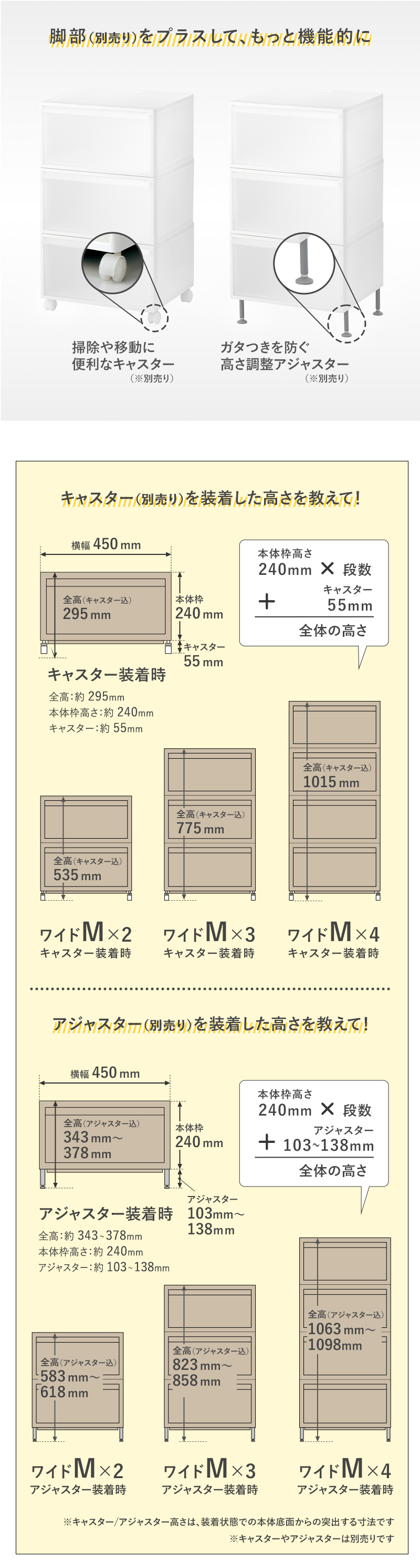 オープンスペースでも使いやすく、リビングや子ども部屋では多段チェストとして、キッチンパントリーでは棚下の引出し収納として活躍します。通常モデル同様、多彩な機能を搭載。利便性と安全性を兼ね備えた、使い勝手抜群のアイテムです。
