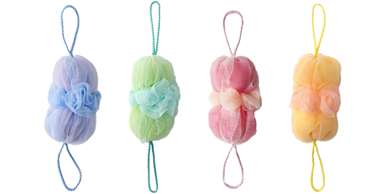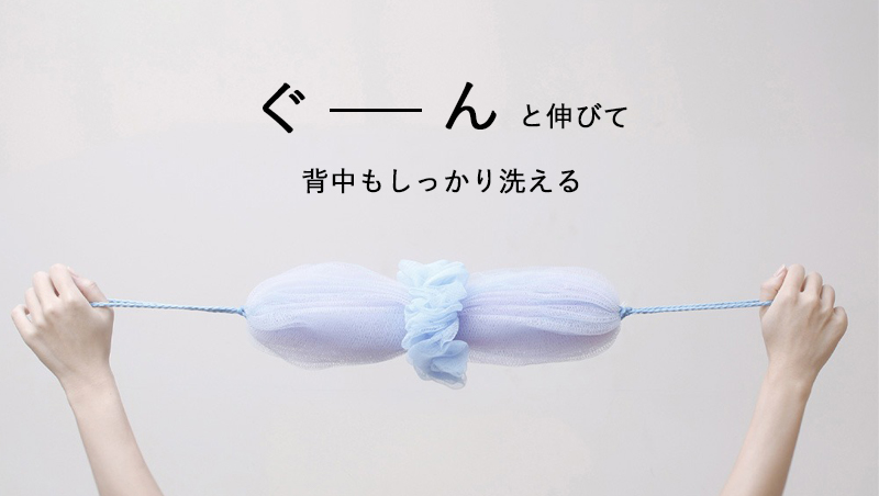 両端のひもを引っ張るとネットがぐーんと伸びる、伸縮タイプのボディスポンジ!