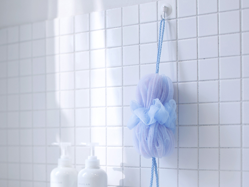 そんな悩みもこのボディスポンジなら、ひもをフックに掛けて水切りでき、乾燥しやすく清潔に収納できます。