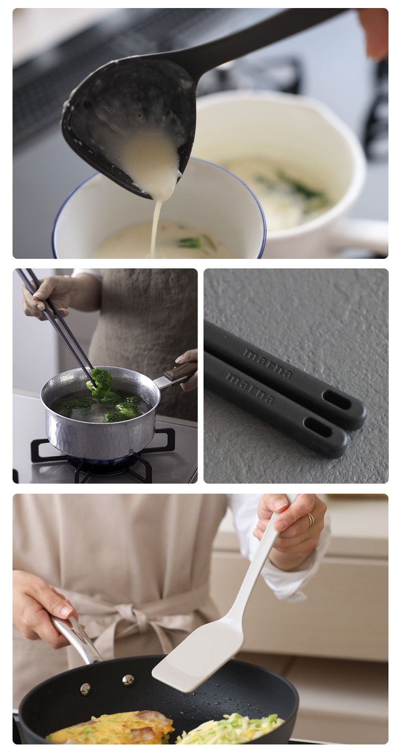 調理に欠かせないキッチンツール、まずは揃えておきたいマストアイテムのお玉・菜箸・ターナーの3点セット。この3点が揃えば、炒め物、汁物、和え物もスムーズに。どれも使いやすさを追求したこだわりのツールです。