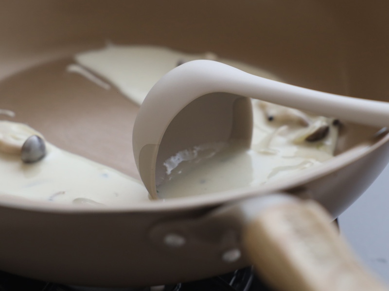よくあるお玉とは異なるハマグリ形状で、鍋底やカーブにピタッとフィット。軽い力で最後までしっかり掬えるお玉。さらに、注ぎやすさもプラス。少し傾けるだけで角からスーッと細く注ぐことができます。