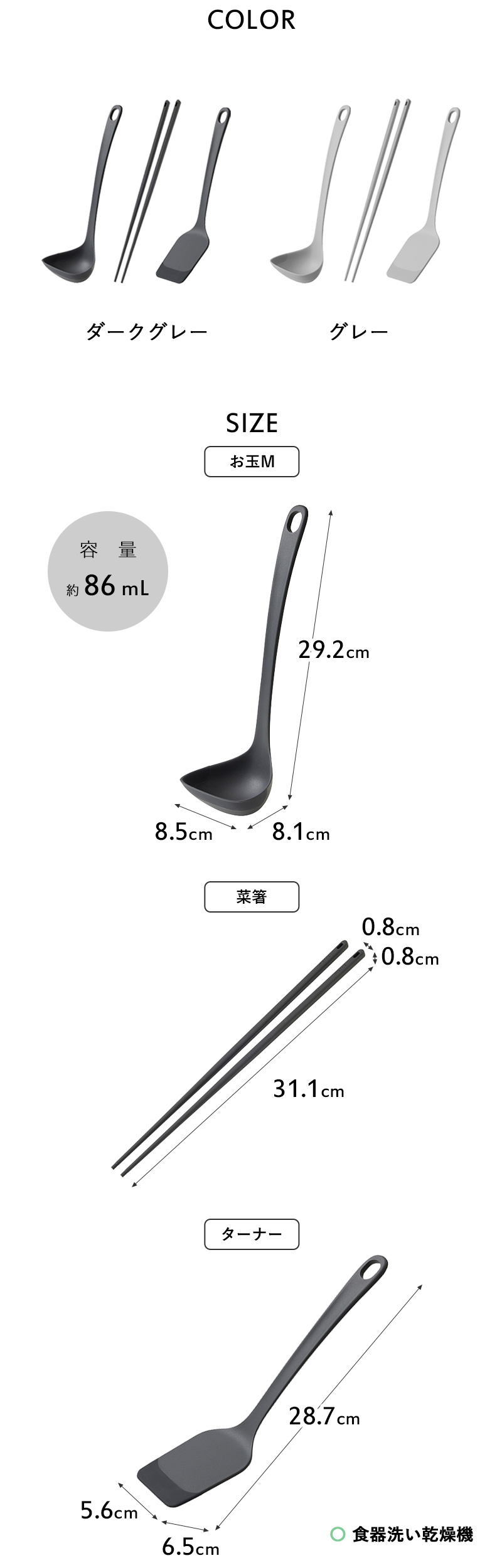 | 重 量 | [お玉M]約 71g [菜箸]約 17g(1本あたり) [ターナー]約 56g |