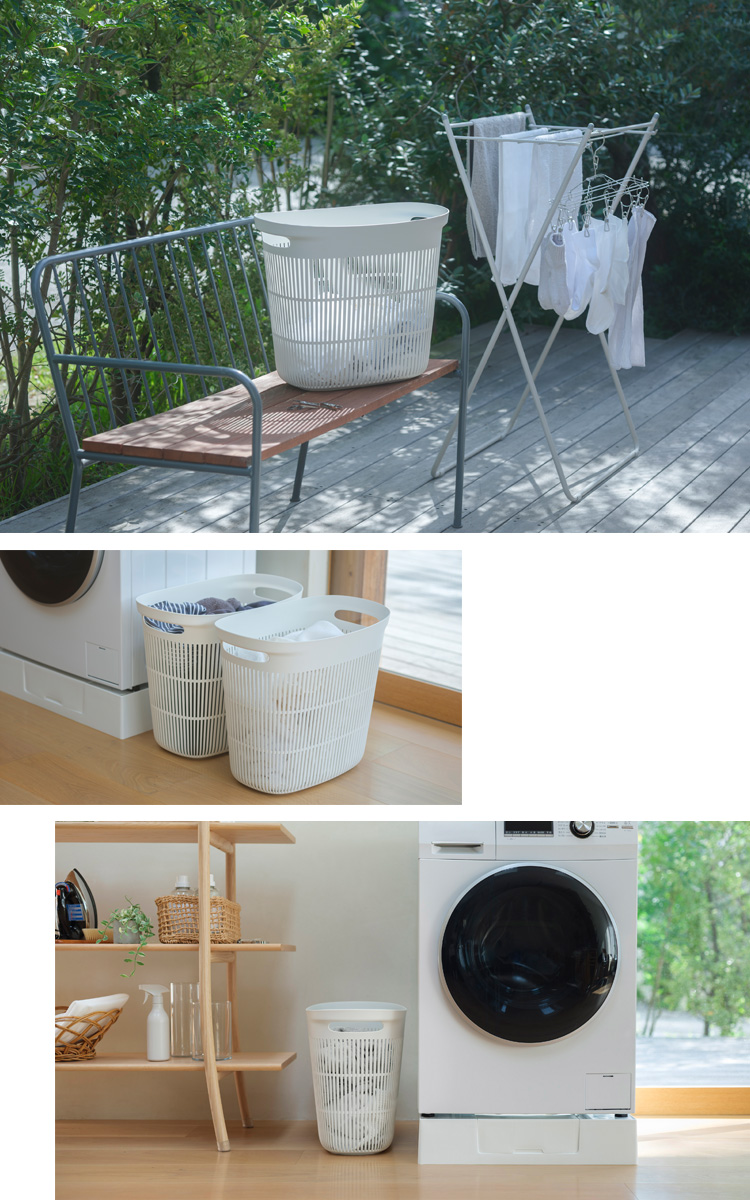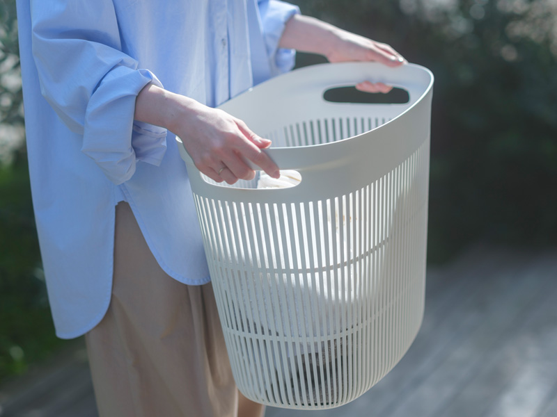 ウッドスラットや日本家屋の格子窓を思わせる細長く密集したスリットのデザインは、お洗濯ものが蒸れないよう通気性を確保しつつ、中身を目隠し、また隙間からお洗濯物がはみ出したりこぼれたりしない絶妙なサイズ。