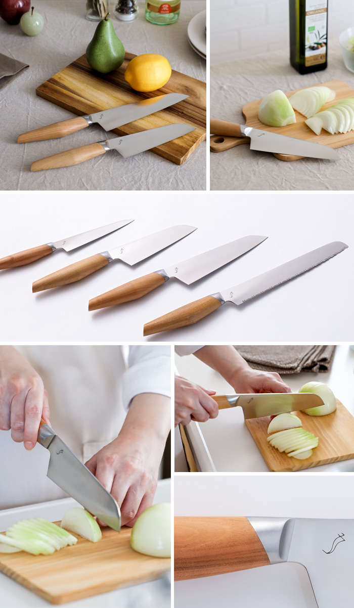 kasaneは、そんな女性の理想を形にしたステンレス包丁。簡単なお手入れを実現するステンレスの良さと、味わいのある木材を生かしたデザインが特徴です。