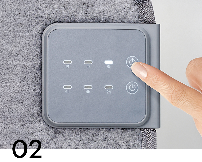 弱・中・強の3段階から選択可能。「電源」ボタンを押すごとに、「強」→「中」→「弱」→「電源オフ」の順に切り替わります。お好みや気温に合わせて、ちょうどいい温かさでご使用ください。