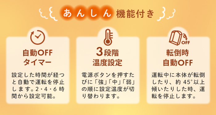 | 機 能 | [温度設定]3段階調整(強・中・弱) [オフタイマー設定]2・4・6時間 [安全装置]転倒時自動オフスイッチ |