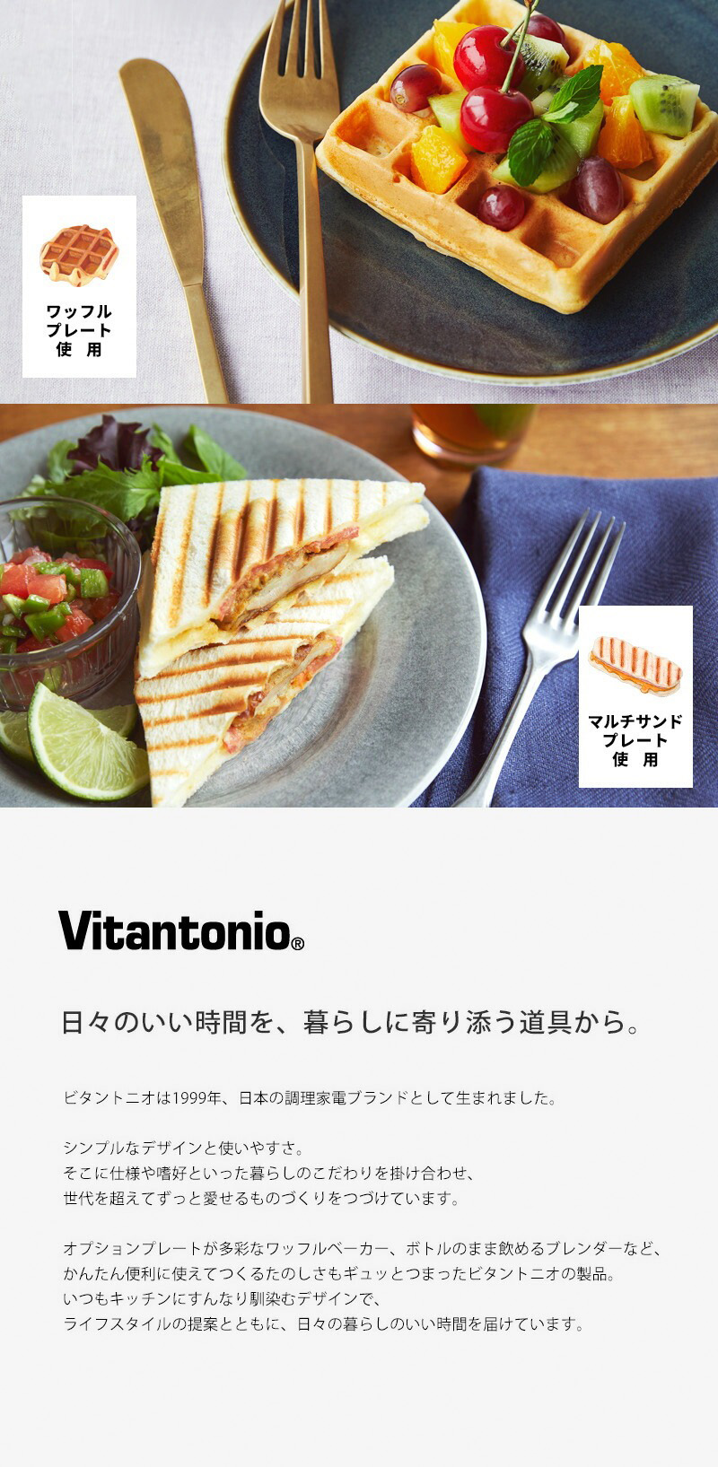 ワッフルプレート…「外はサクっ、中はふわっ」の本格的なベルギーワッフルの焼き上がりを追求したビタントニオこだわりの深型プレート。フルーツやクリームでデコレーションを楽しんだり、甘くない生地で朝食やブランチメニューにも。