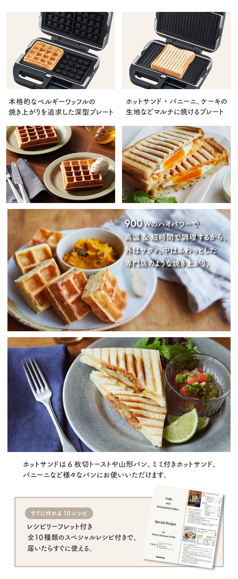 おうちに一台あれば大活躍!楽しくおしゃれな食卓になるワッフルベーカー。900Wのハイパワーでスピーディーな立ち上がり。 焼き上がりを追求した、プレートの形状と高温設計でサクッ、ふわっの焼き上がりをお楽しみいただけます。