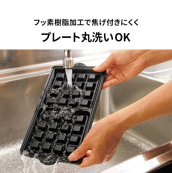 取り外せるプレートはフッ素樹脂加工で調理の汚れがつきにくく、ついても落ちやすい。しっかり丸洗いができるので、お手入れも簡単です。※タワシなど硬いもの・食洗機はご使用いただけません。