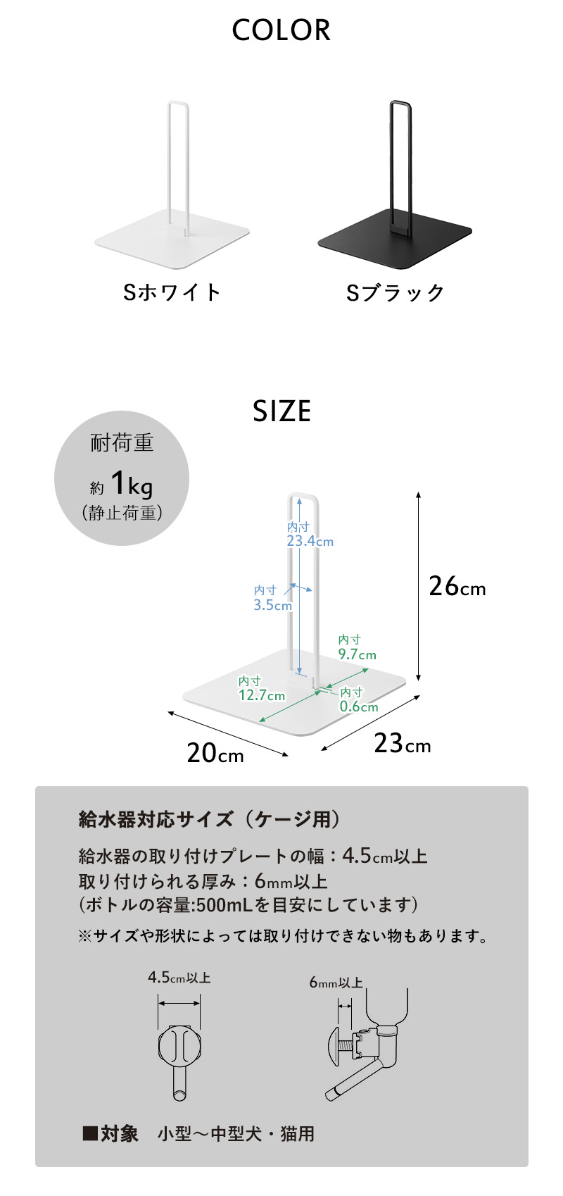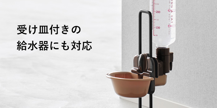 | 備 考 | 組み立て品 <対応サイズ> 給水器の取り付けプレートの幅:4.5cm以上 取り付けられる厚み:6mm以上 (ボトルの容量:500mLを目安にしています) ■対応 小型〜中型犬・猫用 |