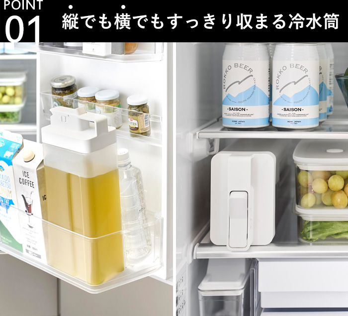 冷蔵庫のドアポケットに立ててすっきりと、棚に倒して置いてそのまま注ぐこともできる、2通りの使い方で毎日をスマートに潤す冷水筒ができました。