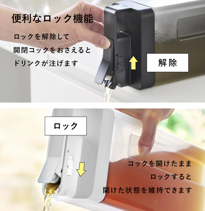 便利なロック機能付きで、横置きするときは、開閉コックの誤作動がないようにしっかりロック。開閉コックを押さえたままだと注ぎにくいと感じたときは、開けた状態でロックしてお使いください。より注ぎやすくなります。