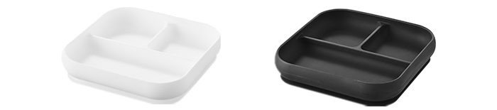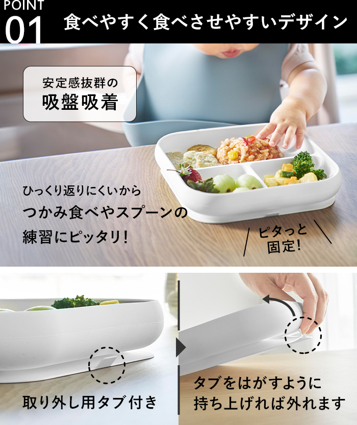底面のシリコーン製吸盤をテーブルに「ぎゅっ」と押しつけるだけで、「ピタッ」と密着します。食器がズレにくく、倒れにくい構造で、手づかみ食べやスプーンの練習にぴったりです。また、取り外しタブ付きだから、テーブルからの取り外しも簡単で使い勝手も抜群です。