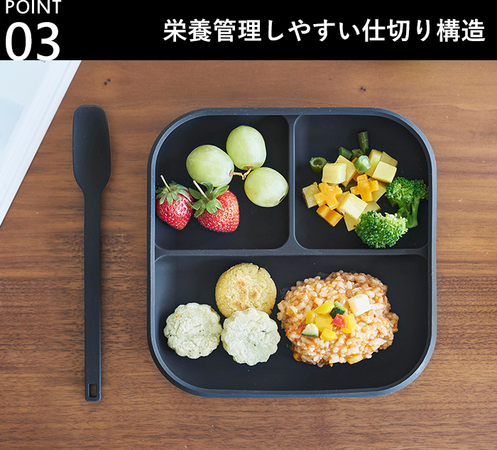 蒸し野菜や果物、小さなおにぎりなど、お子さんが手づかみ食べしやすい食材を、仕切りを使って整理しながら置くことができます。