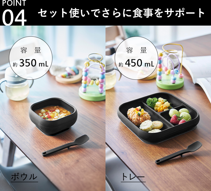 ボウルは離乳食や柔らかい食材、スープなどの液体、ヨーグルトなどの半固形のものに適しています。トレーには蒸し野菜や果物、小さなおにぎりなど、赤ちゃんが手づかみ食べしやすい食材を、仕切りを使って整理しながら置くことができます。