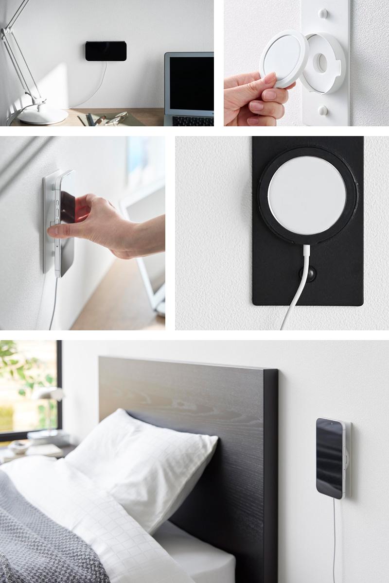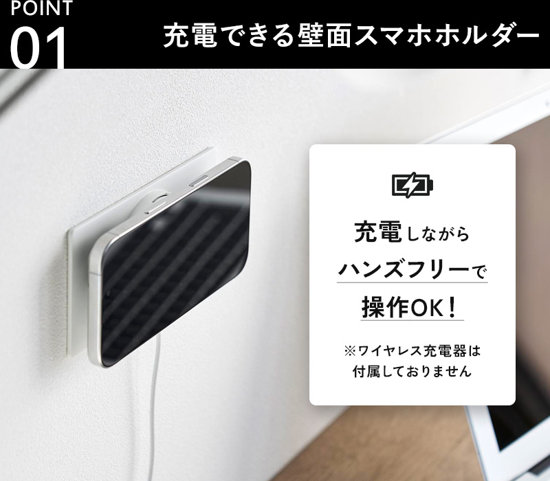 ホルダーにマグネット式ワイヤレス充電器をはめ込んで使用するため、壁面にスマホの充電スポットがつくれます。