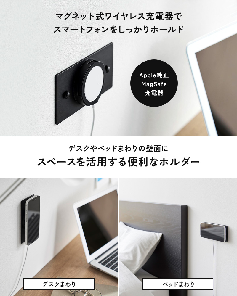 マグネット式ワイヤレス充電器を取り付けて壁面に充電スポットがつくれるスマートフォン充電ホルダー。