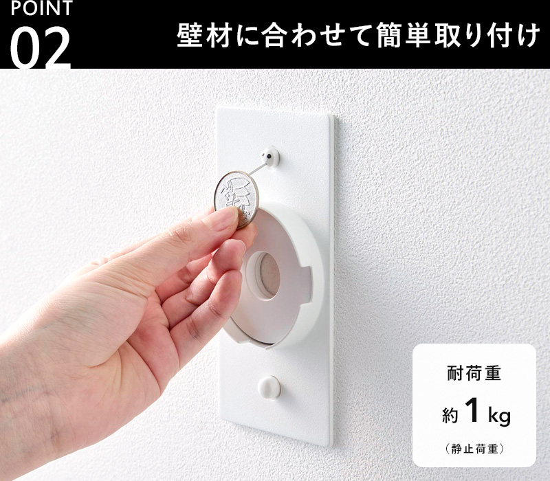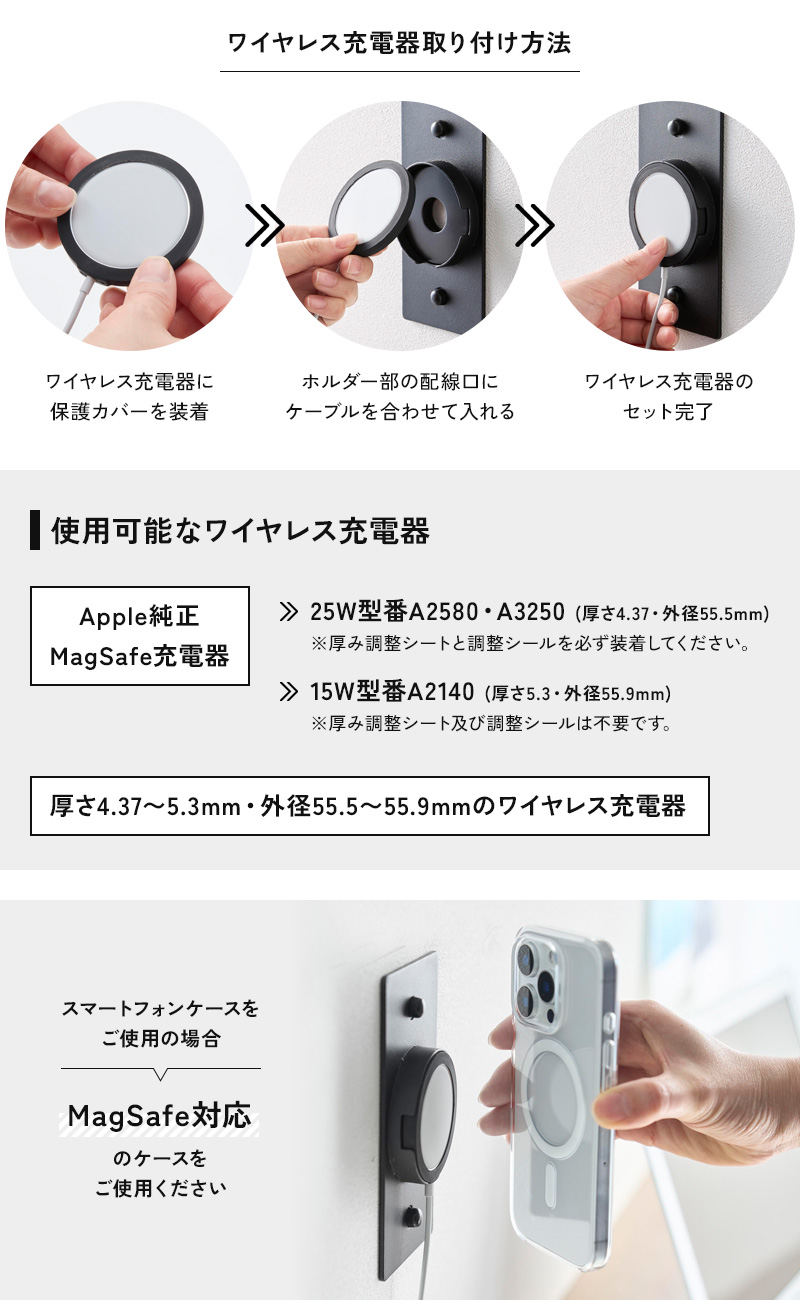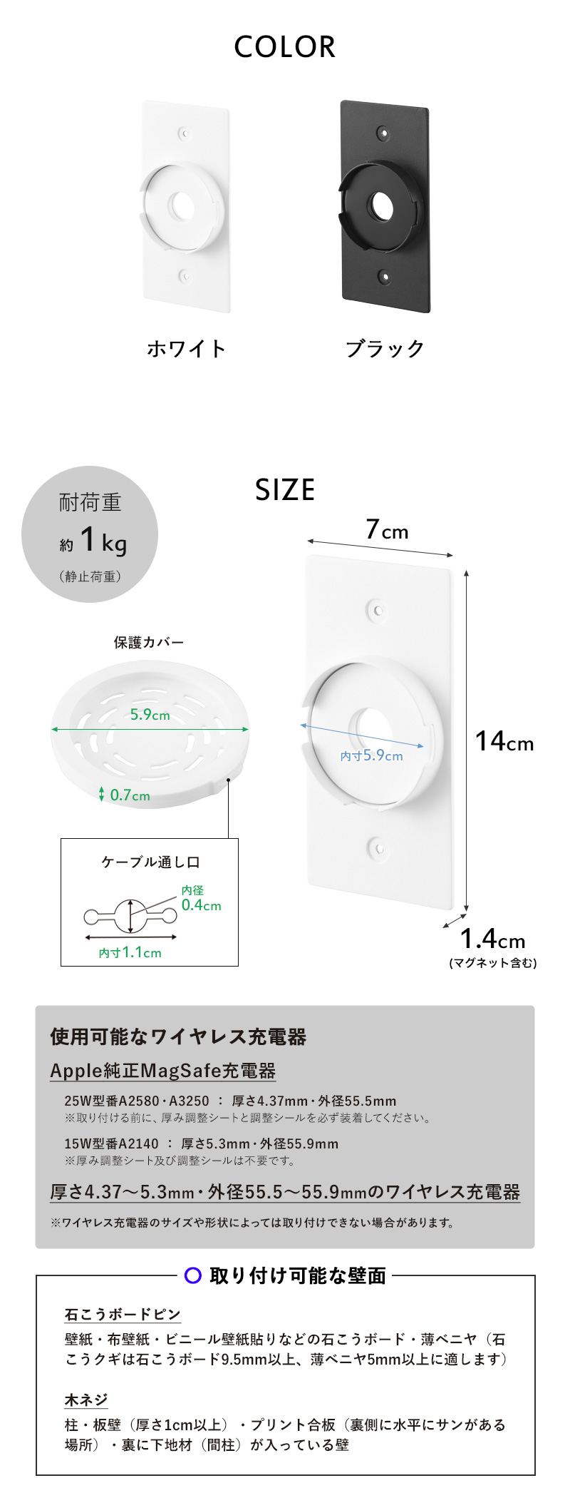 | 備 考 | <対応機種> Apple純正MagSafe充電器(25W型番A2580・A3250 15W型番A2140) <対応サイズ> Apple純正MagSafe充電器(25W型番A2580・A3250:厚さ4.37mm・外径55.5mm 15W型番A2140:厚さ5.3mm・外径55.9mm) 厚さ4.37〜5.3mm・外径55.5〜55.9mmのワイヤレス充電器 <取り付け可能な壁> ◯石こうボードピン使用時:壁紙・布壁紙・ビニール壁紙貼りなどの石こうボード・薄ベニヤ(石こうクギは石こうボード9.5mm以上、薄ベニヤ5mm以上に適します) ◯木ネジ使用時:柱・板壁(厚さ1cm以上)・プリント合板(裏側に水平にサンがある場所)・裏に下地材(間柱)が入っている壁 |