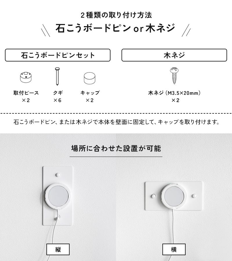 取り付け方法は石こうボードピンと木ネジの2通り。石こうボードピンは簡単に取り付けでき、取り外した跡も目立ちにくいので賃貸住宅でも安心してお使いいただけます。木ネジをご使用の場合はプラスドライバーをご用意ください。