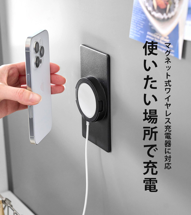 スチール面にマグネット式ワイヤレス充電器を取り付けて充電スポットがつくれるスマートフォン充電ホルダー。