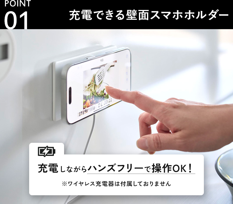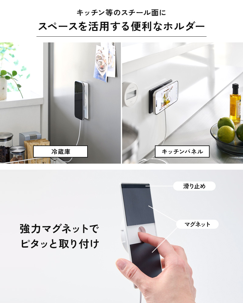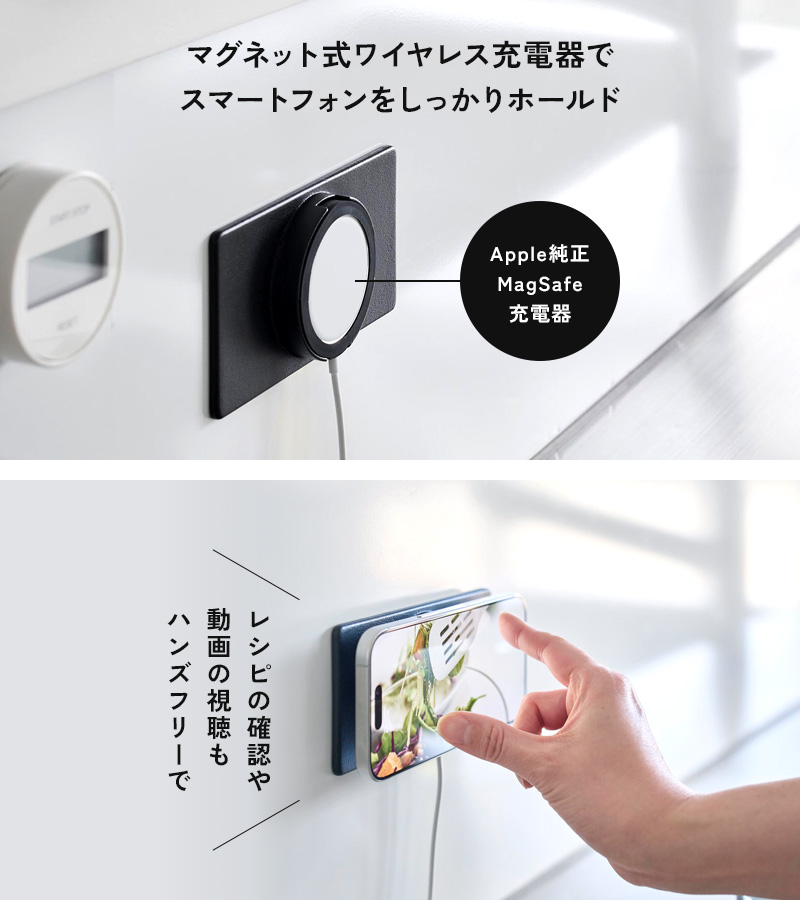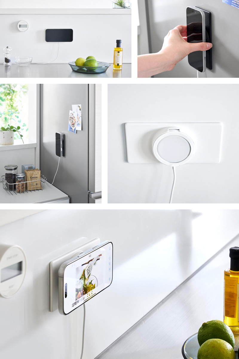 場所を取らない壁面設置なので冷蔵庫やキッチンパネル等に取り付けて、スマホを浮かせて充電できます。欲しい場所に設置できるので、動画視聴や調理中のレシピの確認もハンズフリーで行えます。ケーブルを気にせずスムーズな操作ができるのも便利なポイントです。