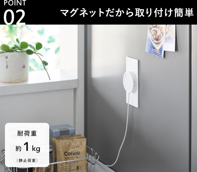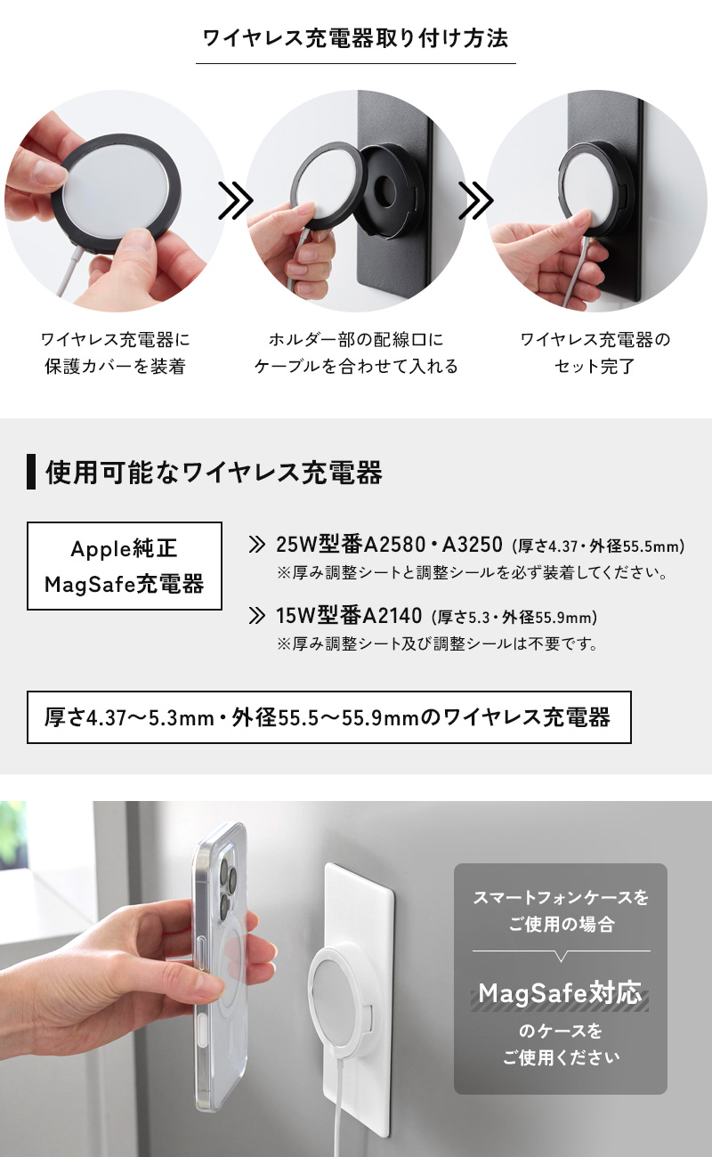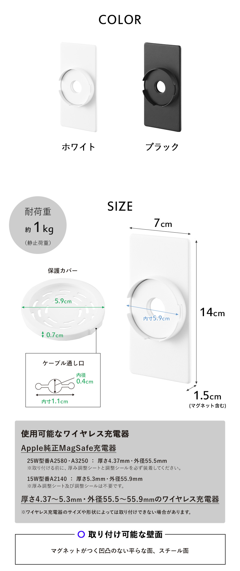 | 備 考 | <対応機種> Apple純正MagSafe充電器(25W型番A2580・A3250 15W型番A2140) <対応サイズ> Apple純正MagSafe充電器(25W型番A2580・A3250:厚さ4.37mm・外径55.5mm 15W型番A2140:厚さ5.3mm・外径55.9mm) 厚さ4.37〜5.3mm・外径55.5〜55.9mmのワイヤレス充電器 <取り付け可能な壁面> マグネットがつく凹凸のない平らな面、スチール面 |