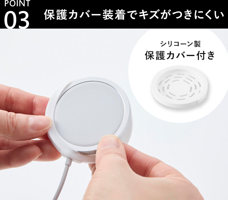ワイヤレス充電器に取り付けるシリコーン製の保護カバーが付属しており、装着することでスマートフォンと充電器の間にクッション性が生まれ、摩擦を抑えて傷つきにくい状態でホルダーを使用することができます。
