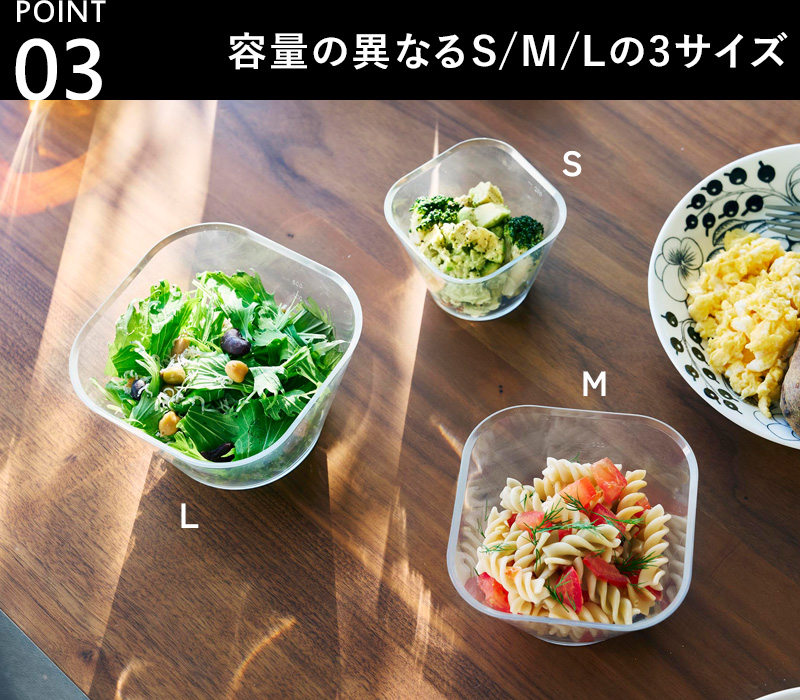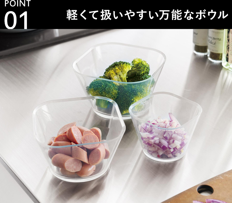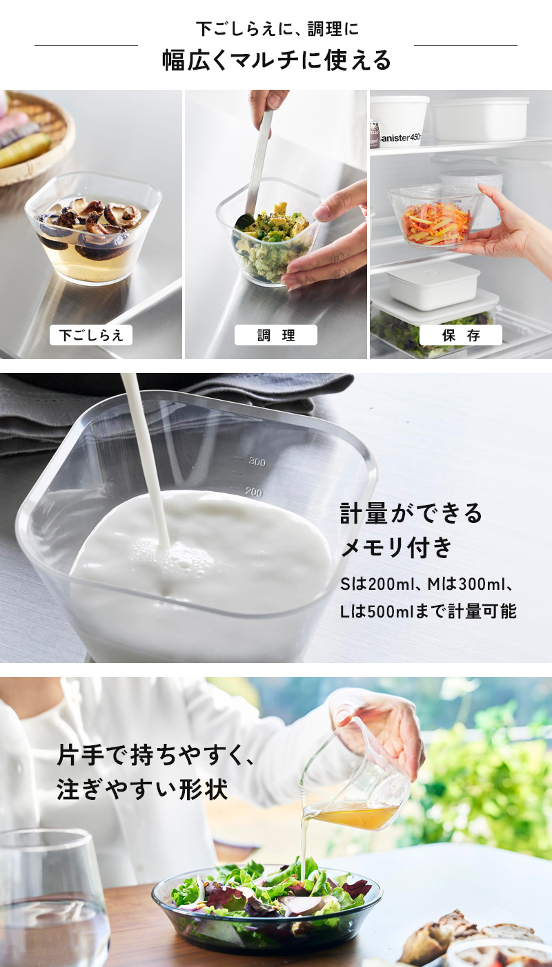 メモリは、S 〜200ml / M 〜300ml / L 〜500ml まで計量することができ、ボウルを計量カップとして活用することも可能です。