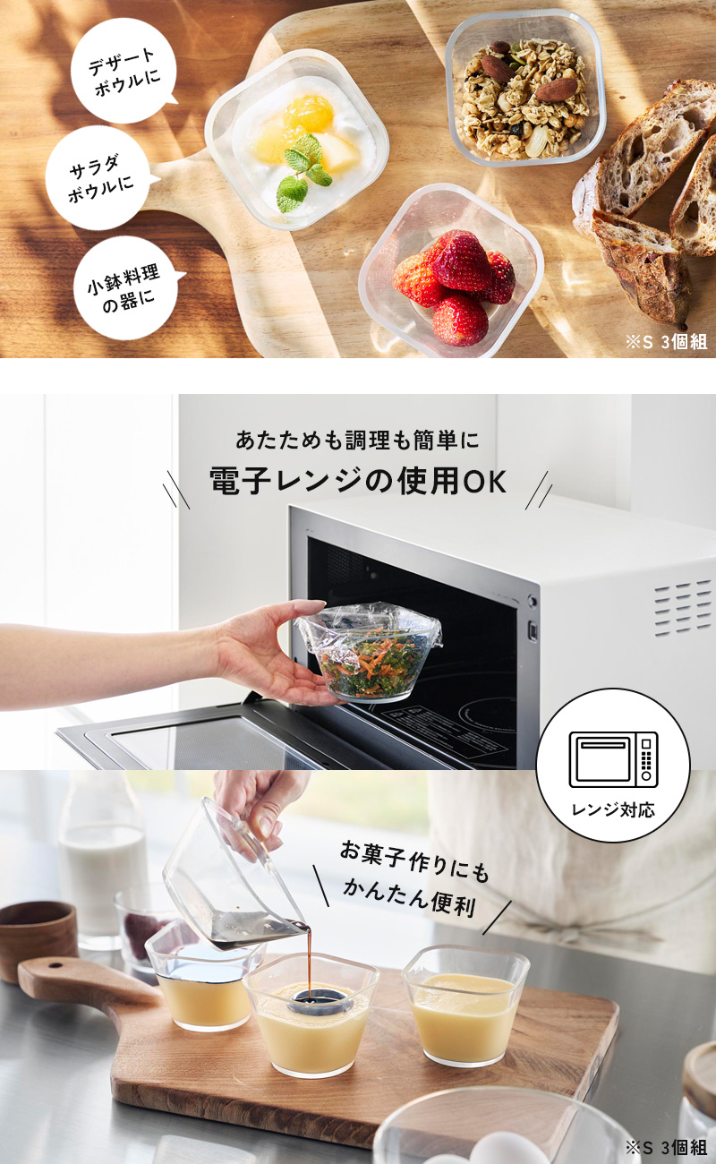 ガラスのように透明感のあるシンプルなデザインなので、器としてそのまま食卓で使うこともできます。野菜を水洗いしてそのままサラダボウルに、ヨーグルトやアイスをソースと混ぜ合わせてデザートボウルに、和え物の小鉢として一品に。