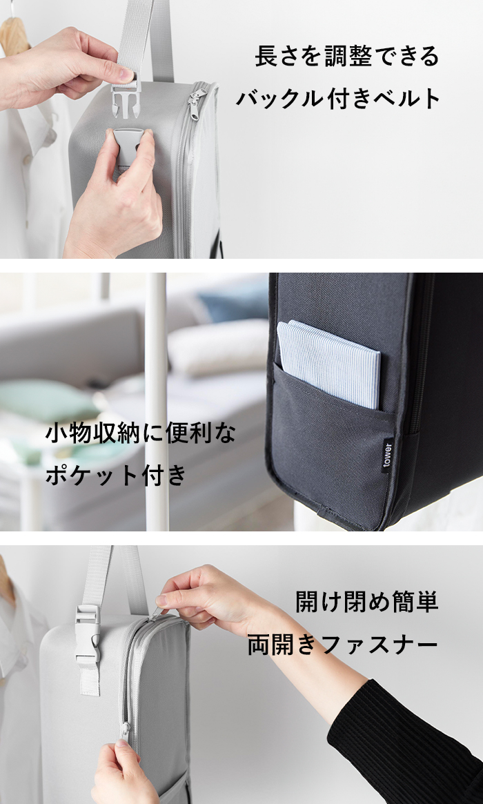クローゼットやハンガーラックに吊り下げて省スペース収納が可能なうえ、棚置きでも美しく整理できるデザイン。