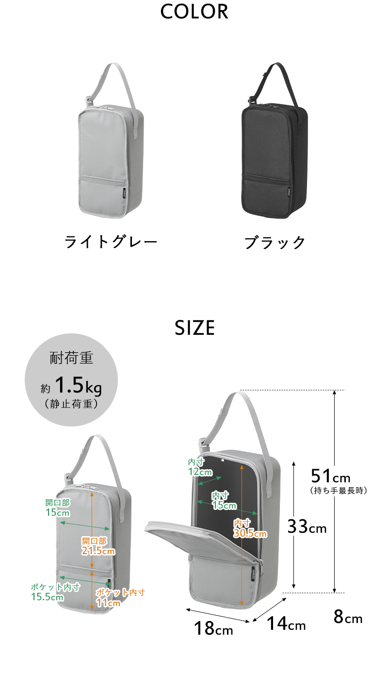 | サイズ | 本体(持ち手含まず):約 幅18 × 奥行き14 × 高さ33cm 本体(持ち手最長時):約 幅18 × 奥行き14 × 高さ51cm 本体内寸:約 幅15 × 奥行き12 × 高さ30.5cm ポケット:約 幅15.5 × 高さ11cm |