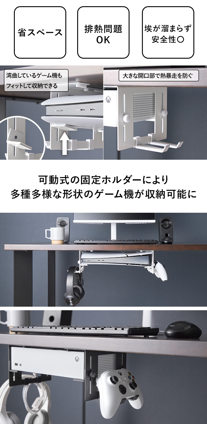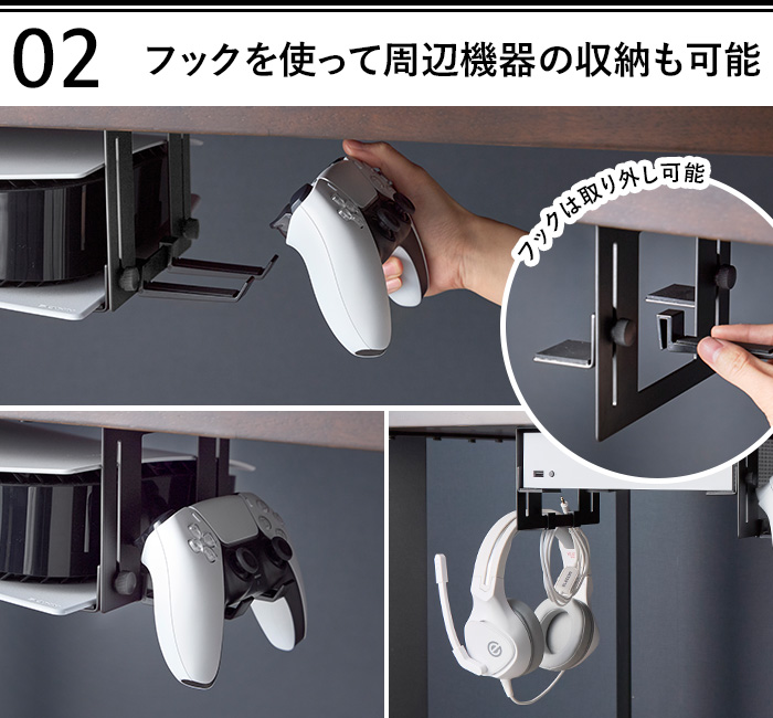 収納部は可動式のため、ゲーム機の形状にフィットし、PS5のような湾曲したゲーム機本体も安定感のある収納を実現。さらに、取り外せるフックを活用すれば、コントローラーやヘッドセットなどの周辺機器もまとめて収納できます。