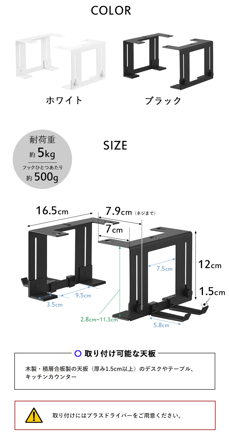 | 備 考 | <取り付け可能な天板> 木製・積層合板製の天板(厚み1.5cm以上)のデスクやテーブル、キッチンカウンター |