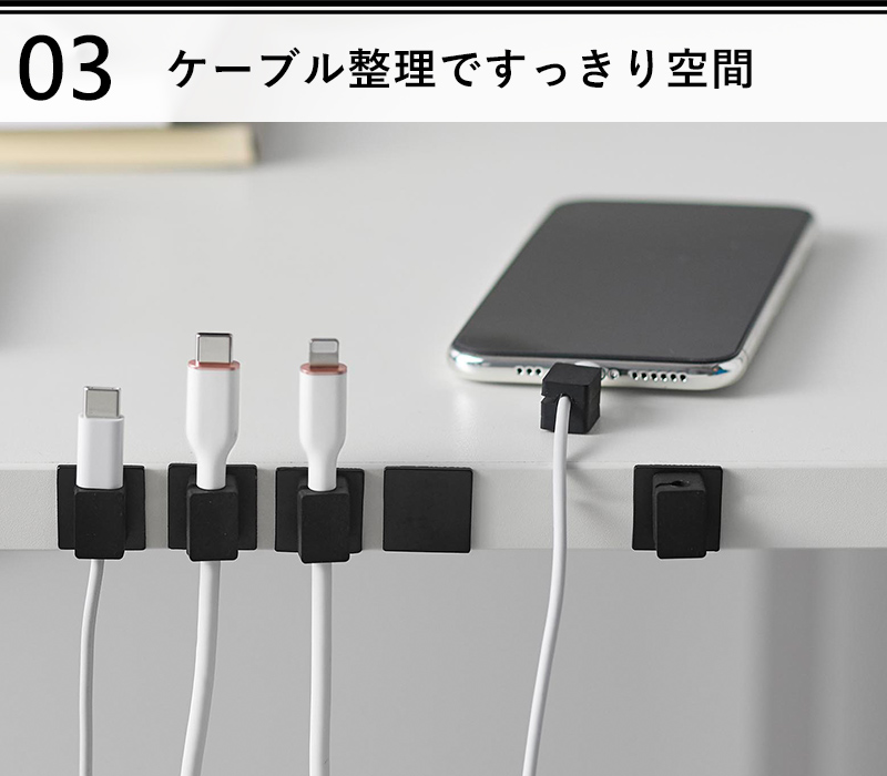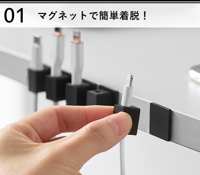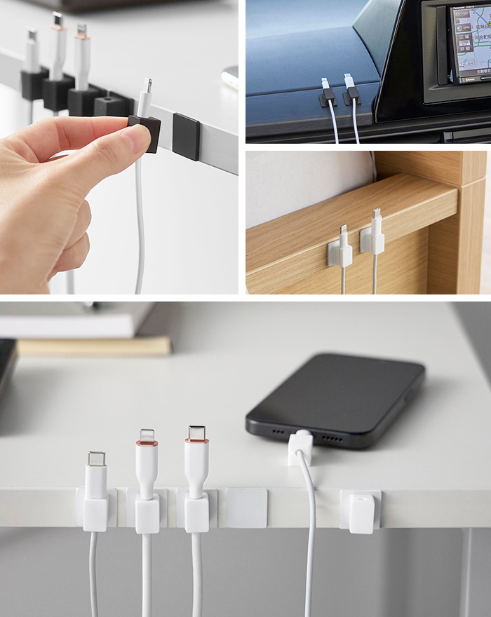 充電ケーブルなど頻繁に使う物でもスムーズに固定・取り外しでき、快適な使用感を実現します。