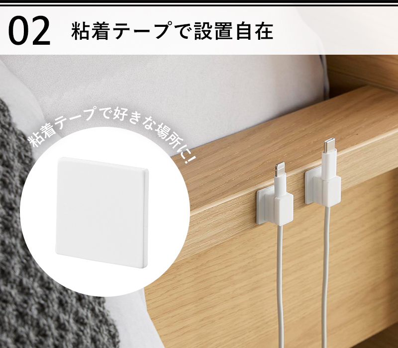 粘着テープでつけられるベース付きだからマグネットがつかない場所でも設置可能。ベッドサイドや車の中でもお好みの位置に取り付けることができます。煩雑になりがちなケーブルをすっきり整理し、日常空間を快適に保ちます。