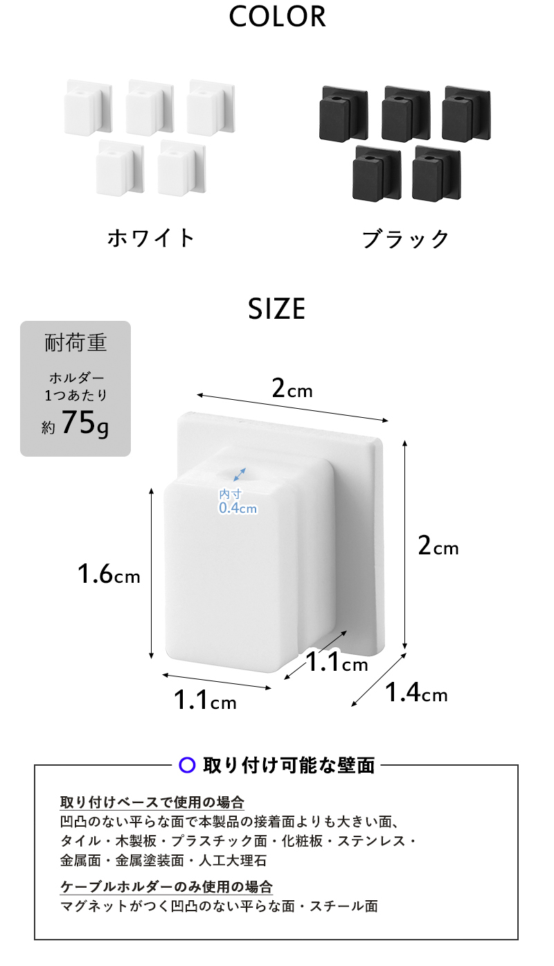 | 備 考 | <取り付け可能な壁面> ○取り付けベースで使用の場合 凹凸のない平らな面で本製品の接着面よりも大きい面、タイル・木製板・プラスチック面・化粧板・ステンレス・金属面・金属塗装面・人工大理石 ○ケーブルホルダーのみ使用の場合 マグネットがつく凹凸のない平らな面・スチール面 |