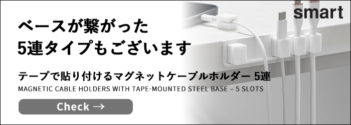 ベースが繋がった5連タイプはこちら⇒「テープで貼り付けるマグネットケーブルホルダー スマート 5連」