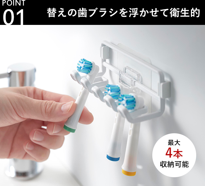 電動歯ブラシの替えブラシを壁面に浮かせて収納。