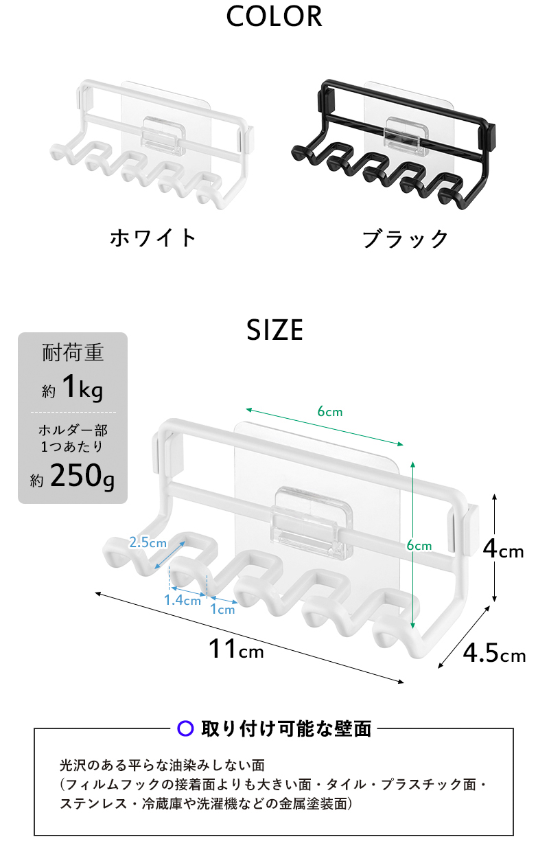 | 耐荷重 | 約 1kg(静止荷重) (ホルダー部1つあたり:250g) |